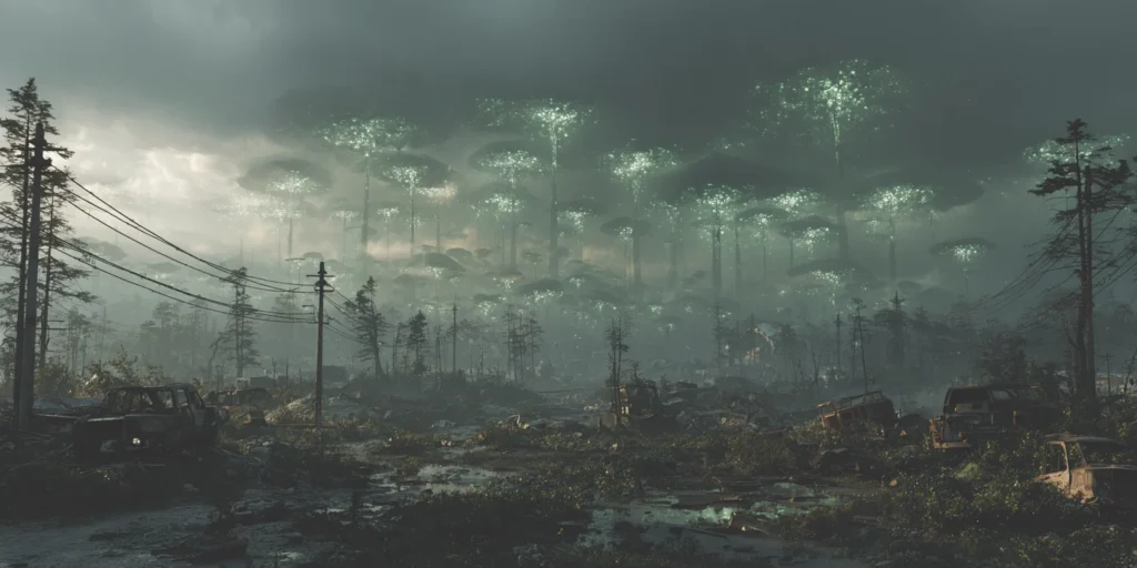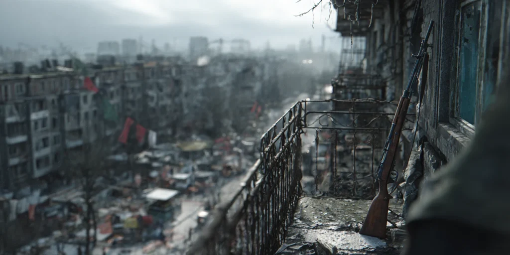 一艘破损至几近断裂的军舰撞上拉脱维亚北部荒滩。甲板满是弹孔与烧痕,信号灯持续闪烁求救代码,舰身涂有泥沙与碎片,但无一人生还。